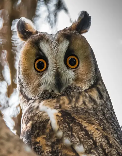 Males and females look alike and are predominantly buff-brown with darker brown streaks. The belly is paler with bold streaking and the tail feathers are finely barred. Their eyes are a deep orange, surrounded by golden-buff coloured facial disk feathers, and the hooked bill is blackish. The legs and feet are feathered. Long-eared Owls are nocturnal and rarely seen in the daytime. The best time to see them is in the winter, when you may stumble across them roosting in a bush or tree.