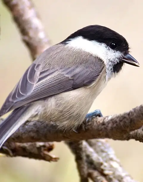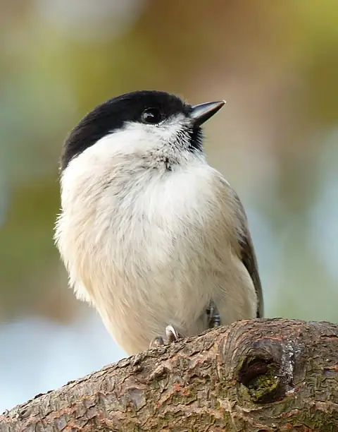 The Marsh Tit is less scruffy looking than the Willow Tit and has a neater, smaller bib and glossier black cap. Also, the Marsh Tit lacks the pale wing panel, does not look "bull-necked" and usually has a square-ended tail but is sometimes slightly forked. A more reliable method of differentiating the two species is by their calls. The Marsh Tit call sounds like a ringing sneeze, "pitchoo", which sometimes precedes a trilling "chickabeebeebeebee".